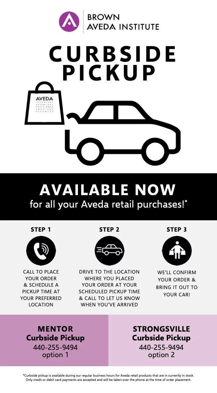 *Curbside pickup is available during our regular business hours for Aveda retail products that are in currently in stock. Only credit or debit card payments are accepted and will be taken over the phone during order placement or at the time of pickup.
